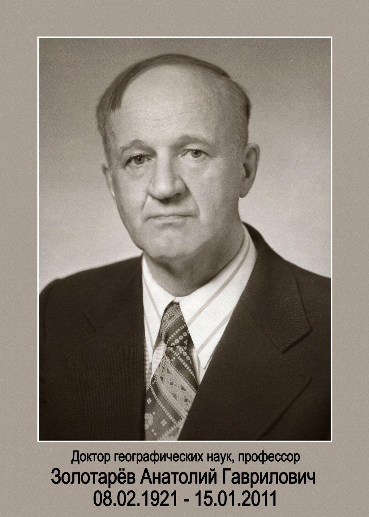 Анатолий Гаврилович Золотарев (08.02.1921-15.01.2011) – известный сибирский ученый-геоморфолог, доктор географических наук, профессор, трудовая деятельность которого от ассистента до заведующего кафедрой и декана была связана с географическим факультетом ИГУ. Он был любим студентами, его уважали преподаватели, ученые, геологи-производственники за глубокие знания в области геоморфологии, физической географии, новейшей тектоники, коррелятных отложений. А.Г.Золотарев - заслуженный деятель науки РФ, почетный член Русского географического общества, Ветеран войны (награжден 14 боевыми и трудовыми орденами и медалями).