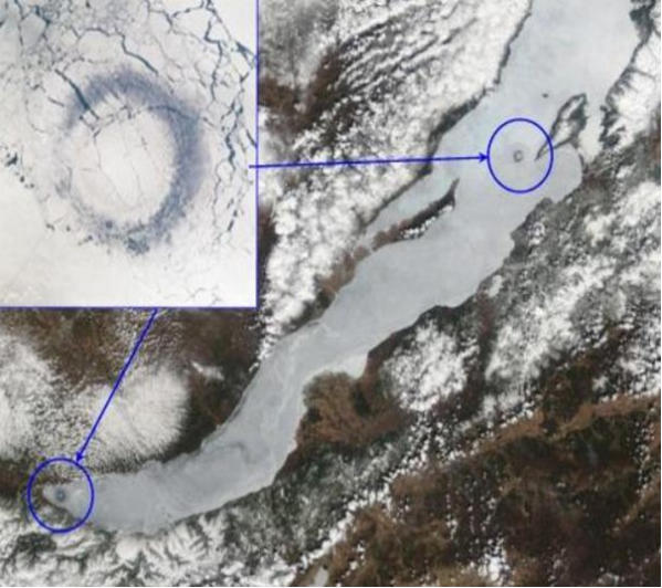 В качестве примеров проявления дегазации Земли можно привести образование кольцевых структур проседания, в пределах которых фиксируется повышенное содержание водорода. Аналогичные структуры зафиксированы на ледовом покрове, в том числе оз. Байкал, которое не только является активной рифтовой зоной, но и районом частых погодных и климатических аномалий.